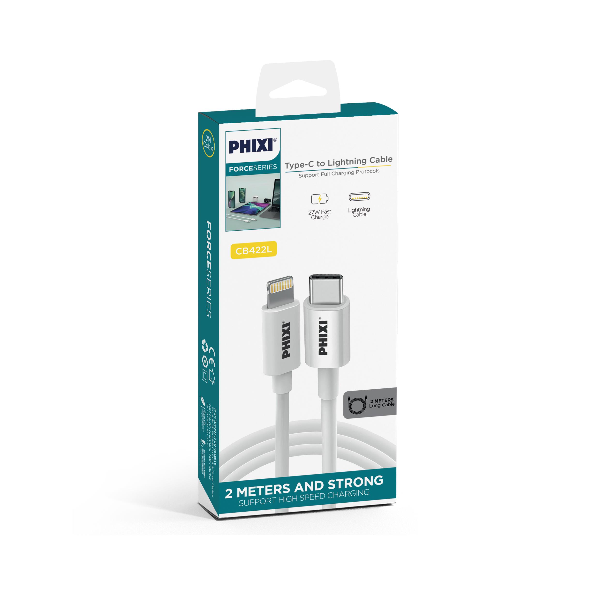 PHIXI CB422L Type-C to Lightning kablo, 27W hızlı şarj desteği ile iPhone ve Lightning girişli Apple cihazlar için yüksek performanslı şarj ve veri aktarımı sağlar. 2 metre uzunluğu sayesinde daha rahat ve esnek kullanım sunar.