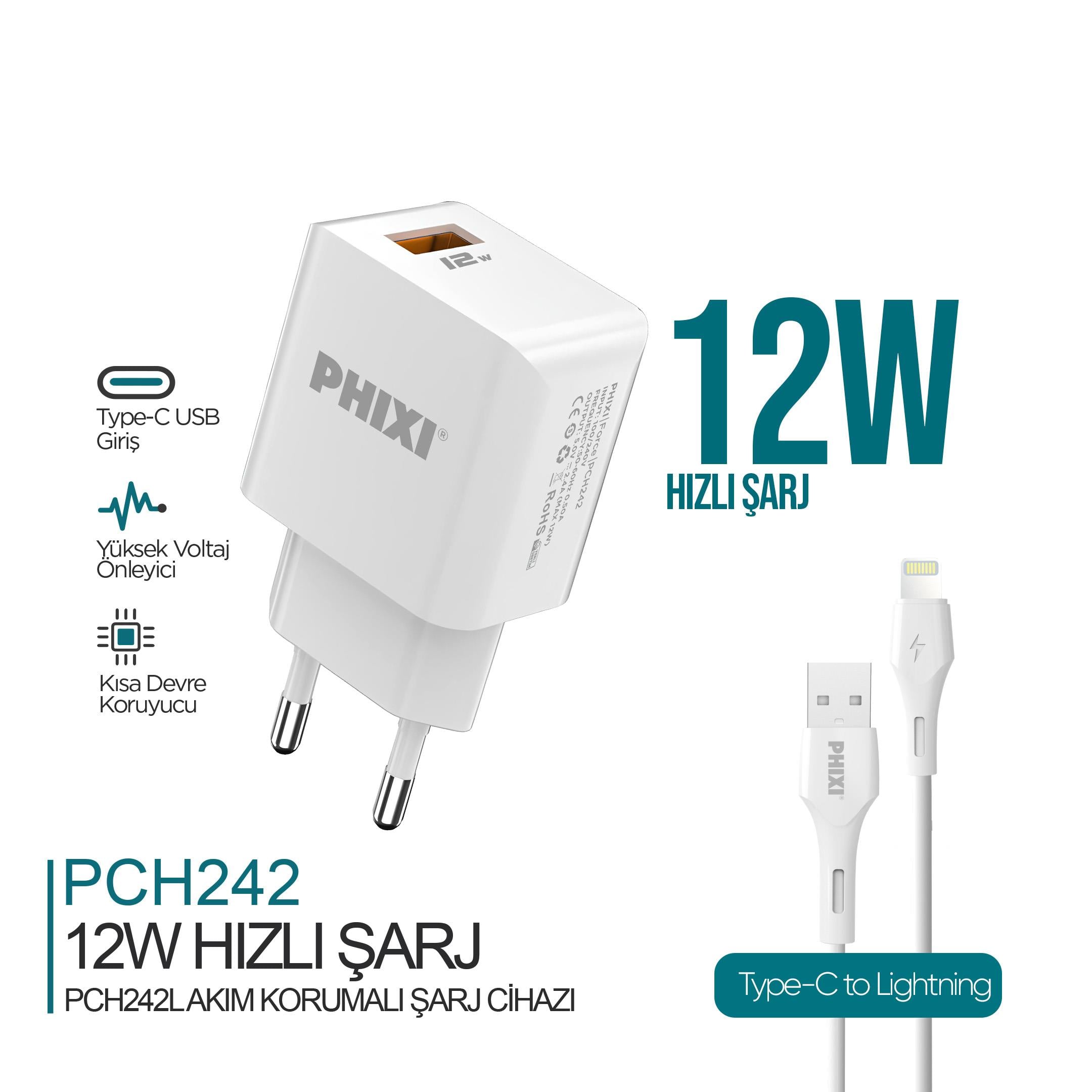 Phixi PCH242L Force Akım Korumalı 2.1A Lightning USB Kablolu Şarj Cihazı