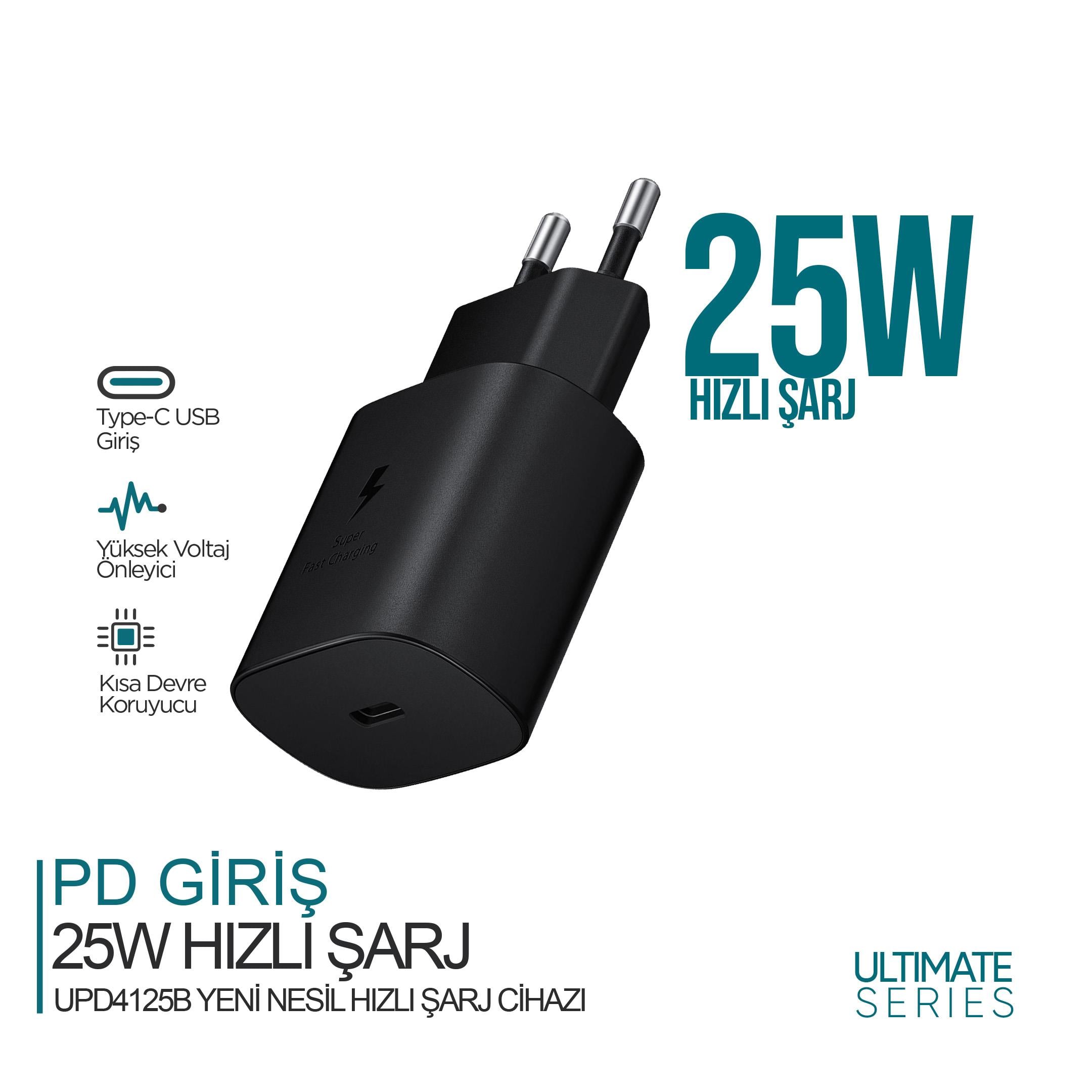 Ultimate Serisi UPD4125B 25W Type-C Girişli Hızlı Şarj Adaptörü, modern cihazlar için yüksek performans ve güvenliği bir arada sunan premium bir çözümdür.