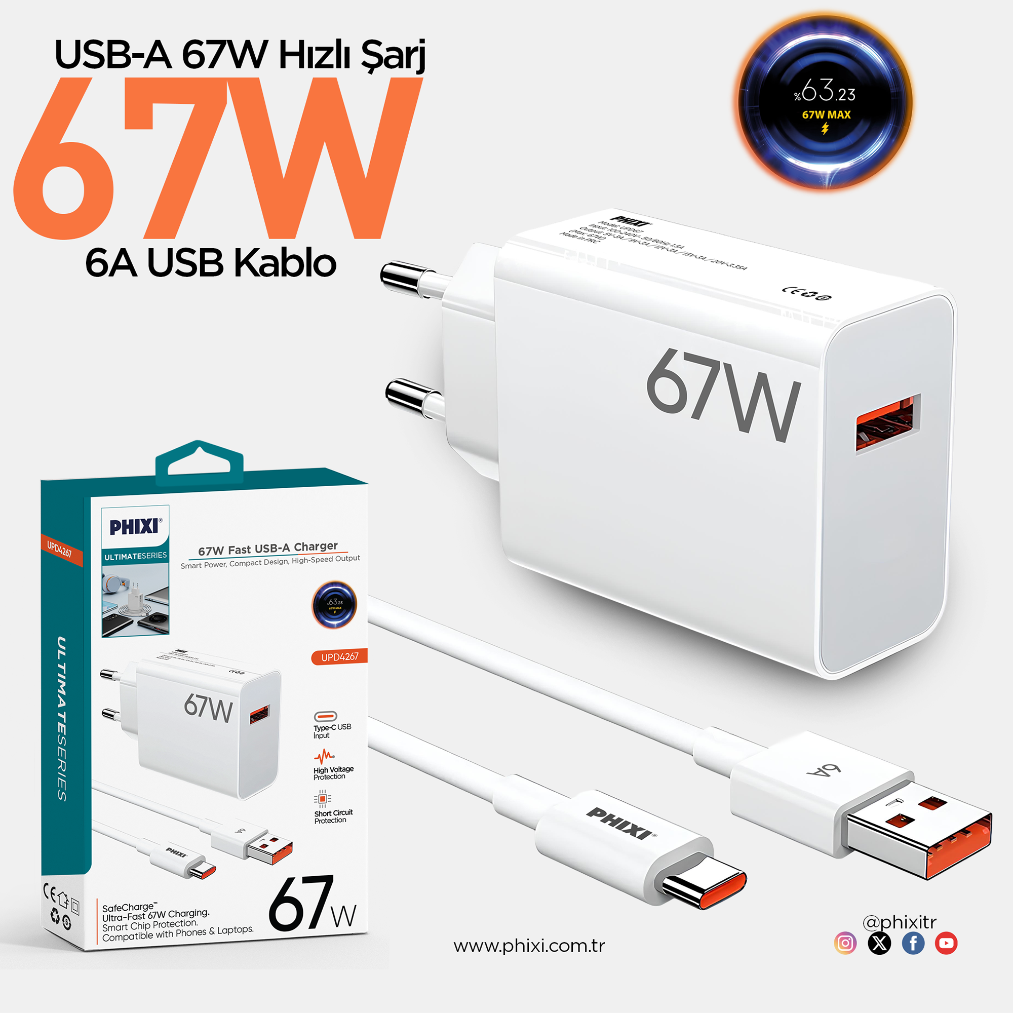 Ultimate UPD4267, 67W yüksek hızlı şarj desteği ile Xiaomi cihazlarınızda Fast Charge performansı sunar. Type-C şarj cihazı ve USB-A kablo ile uyumlu, kompakt ve güvenli kullanım sağlar. Toptan satışlarda uygun fiyat ve yüksek kalite avantajı öne çıkar.